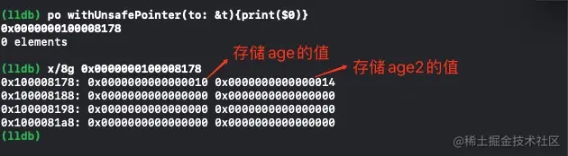 po withUnsafePointer(to: &age){print($0)} - 查看age内存情况: