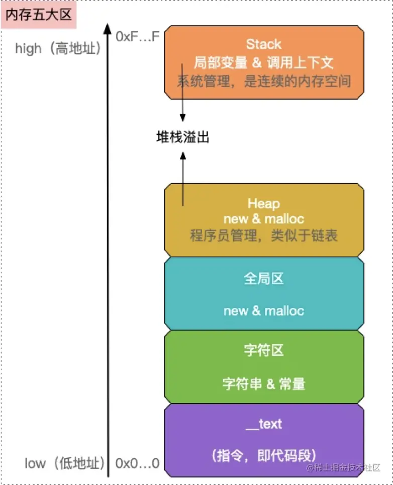 堆栈溢出,可以理解为栈区与堆区边界碰撞的情况。 - 全局区、常量区都存储在__TEXT cString段。