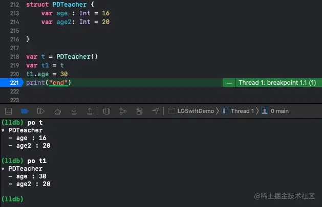 - 直接打印t及t1,可以发现t并没有因为t1的改变而改变,主要是因为