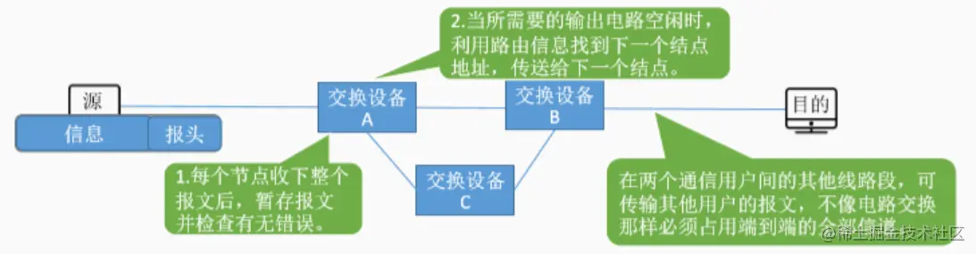 什么是存储转发呢:比如说 A 发送报文给 C,需要经过 B,那么 B 必须收到完整的报文并检查有无错误后才能进行转发。这也不难理解,因为该报文中包含 C 的地址,如果不是完整的报文,B 也不知道该发给谁