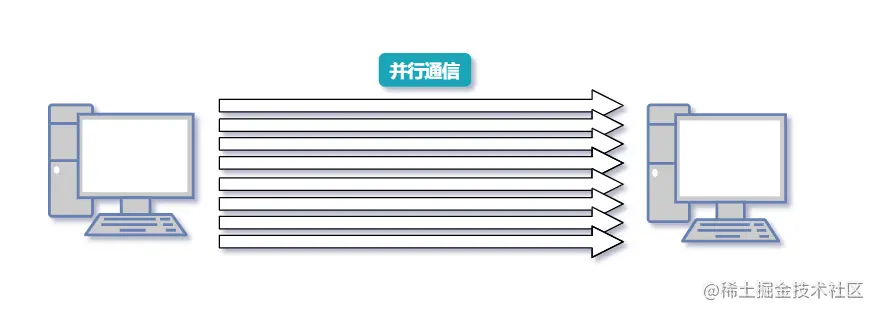 并行传输是将数据以成组的方式在两条以上的并行信道上同时传输。例如采用 8 单位代码字符可以用 8 条信道并行传输,一条信道一次传送一个字符。因此不需额外的措施就天然的实现了收发双方的字符同步。