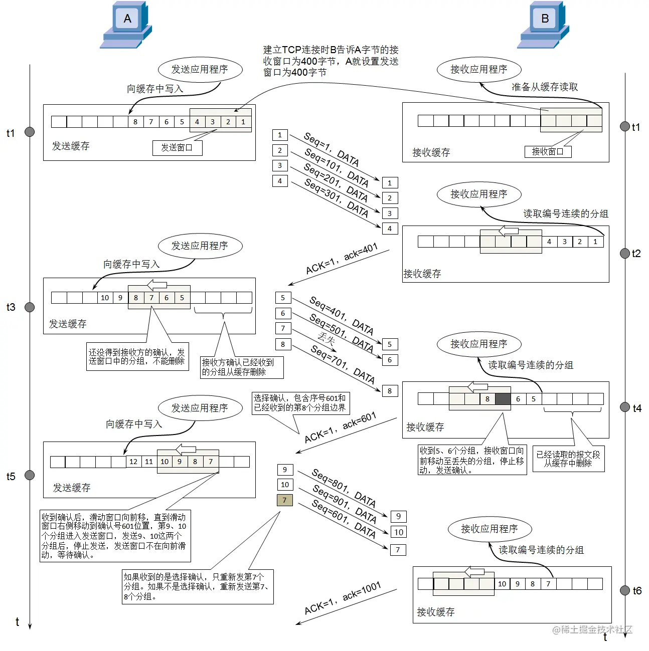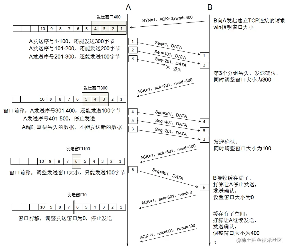 - 滑动窗口的大小由接收方缓存大小决定。