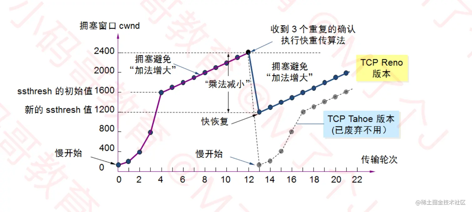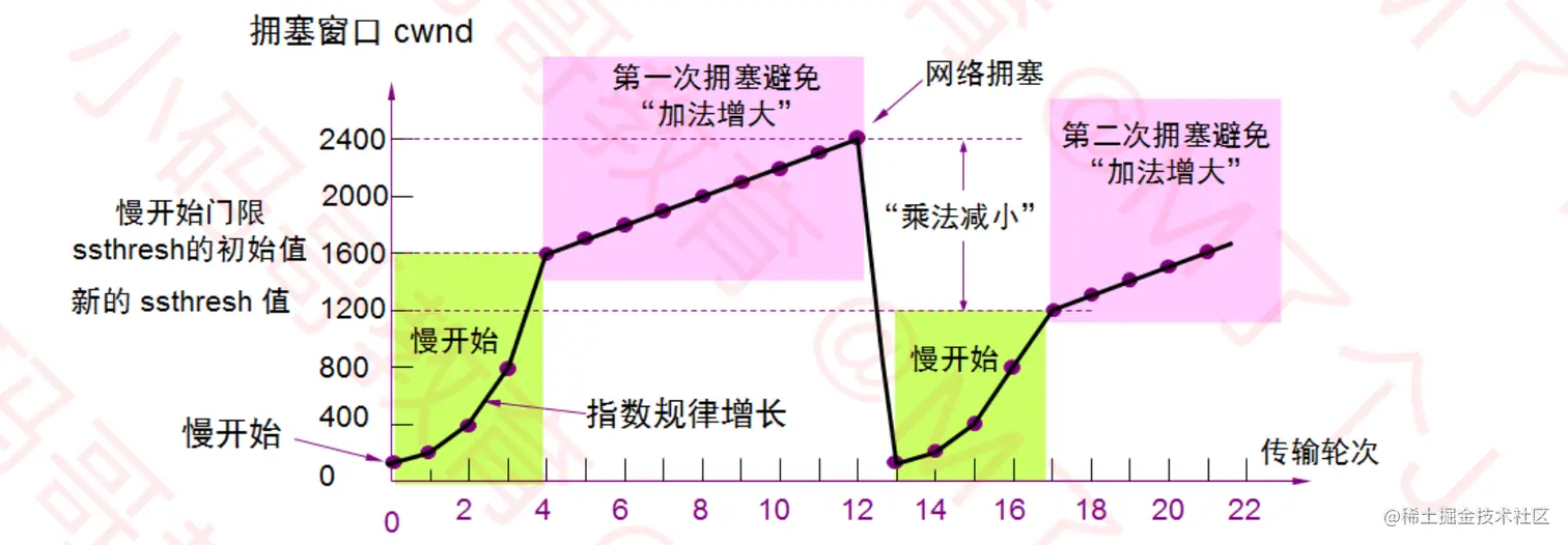 ssthresh(slow start threshold): 慢开始阈值,cwnd达到阈值后, 以线性的方式增加- 拥塞避免(加法增大):拥塞窗口缓慢增大,以防止网络过早出现拥塞