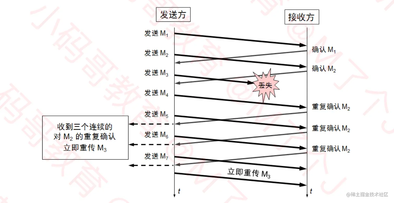 - 只要连续收到三个重复确认(总共