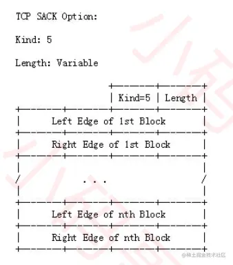 SACK信息会放在TCP首部的选项部分Kind:占1字节。值为5代表着是SACK选项Length:占1字节。表明SACK选项一共占用多少字节Left Edge:占4字节,左边界Right Edge:占4字节,右边界