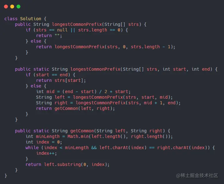 方法三:分治:先将数组二分,再对每一个子数组二分,再对每一个数组再二分(这里可以用递归),直到分到每个元素为一个子数组,然后求两个元素的公共前缀,再向上层递归,再求第二层的公共前缀。