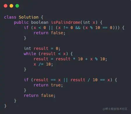 比较方法,可以参考整数反转的部分算法,反转X,当反转到一半的时候,也就是result <= x的情况下,比较两个数是否相等。