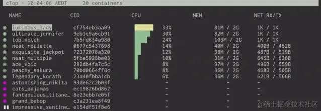 实现了类 top 命令展示效果的 docker 容器监控工具