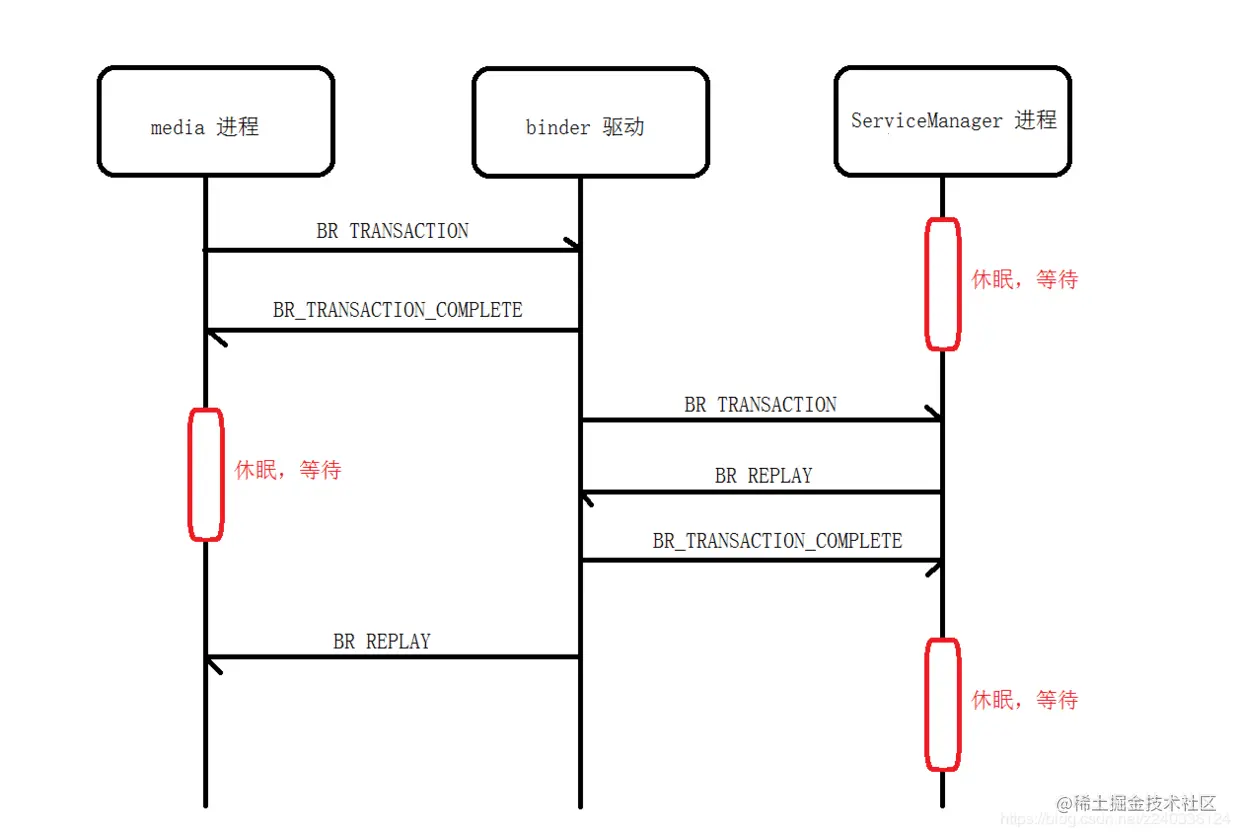 // 通过 ioctl 不停的读写操作,跟 Binder Driver 进行通信,转发给 ServiceManager 进程
