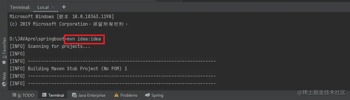 1.在项目控台执行mvn idea:idea命令,也可以在项目目录Cmd执行,补全Idea缺少的插件依赖。