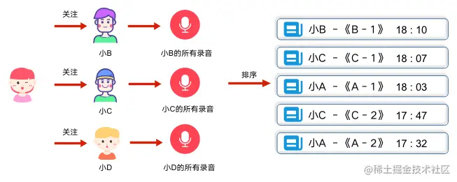 在针对SQL进行分析后,我们发现问题出在关注人录音的获取和排序上。一些头部活跃用户,关注了上万人,而单个用户平均发布几十个录音,这就意味着每一次获取列表时,拉取的数据量 = 关注人数 * 发布录音数,将几十万数据拉取到内存中排序和分页,成本很高。想解决这个问题,需要回归Feed流本身。