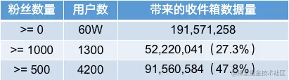 60W用户带来的收件箱数据量在1.9亿左右,其中有接近一半(47.8%)的数据产生自4200个粉丝数量大于500的用户。这部分用户虽然不多,但是他们的粉丝多,动态发布频繁,活跃度高,我们通常称之为“大V”用户。