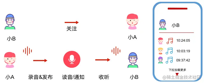 很典型的Feed流场景,类似新浪微博、微信朋友圈。用户生产内容,平台再将内容分发传递给用户。 业务初期,功能实现的很简单,只保留最基础的用户关系和录音记录。当用户在个人首页查看其它用户录音时,会转化为这样一个流程: