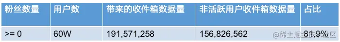 继续从数据出发,收件箱动态是给粉丝用户看的,那么也看看粉丝用户。当粉丝用户上线活跃时,就会拉取动态查看最新的Feed流信息。但是,用户都是活跃的吗?当然不是。 因此我们也做了一次数据推算,同样抽取60W用户,看非活跃用户群体收件箱的数据量: