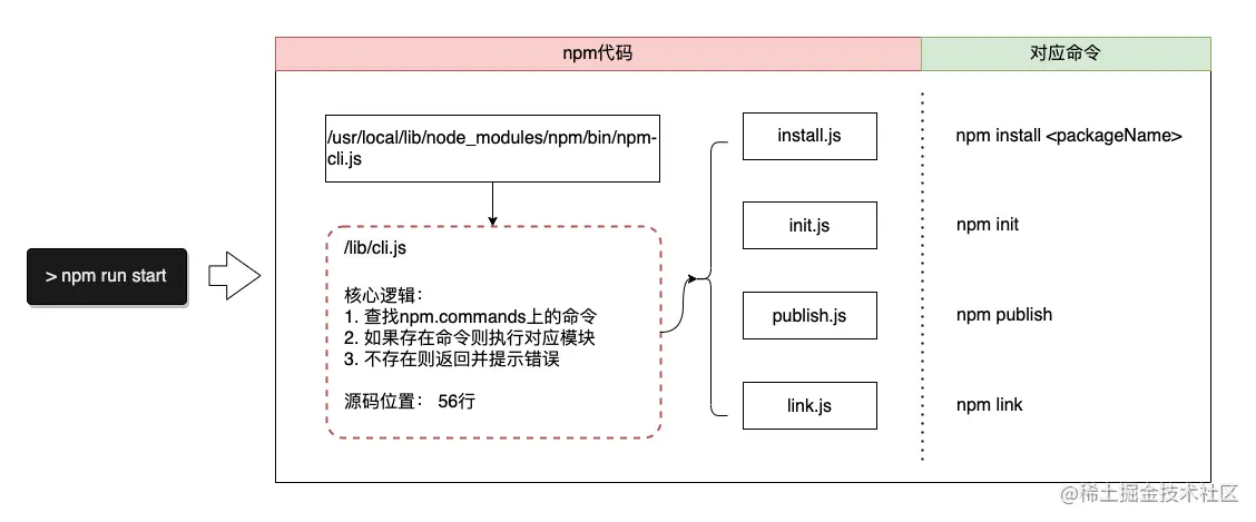 那么实际上执行npm命令的调用关系是什么?实际是执行哪个脚本呢?