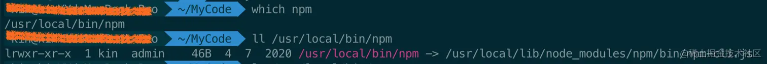 > lrwxr-xr-x 1 kin admin 46B 4 7 2020 /usr/local/bin/npm -> /usr/local/lib/node_modules/npm/bin/npm-cli.js