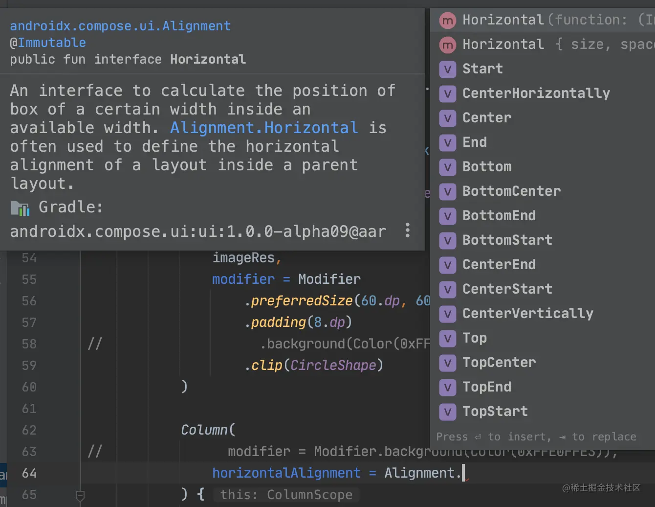LinearLayout 还有一个常用属性是 gravity,在 Compose 中等价于 Row 的 verticalAlignment 和 Column 的 horizontalAlignment。