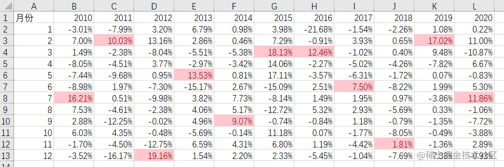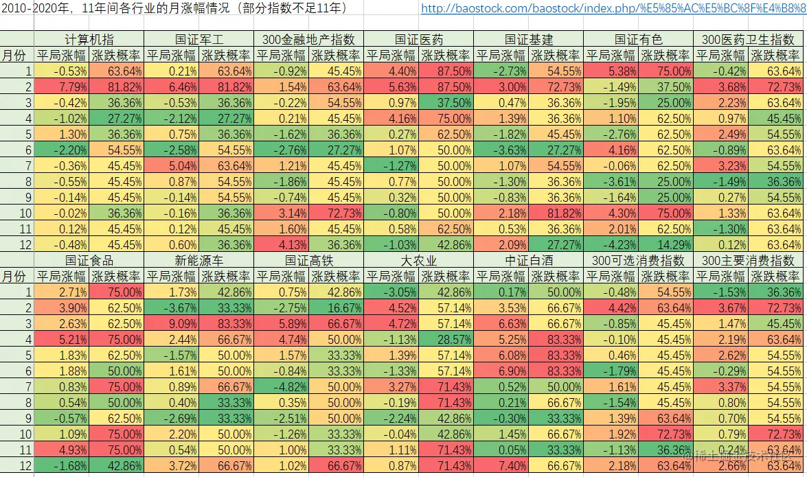 2010-2020年,11年间各行业每月的涨跌概率和平局涨幅