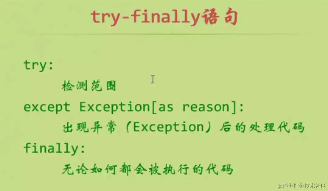 如果异常发生在成功打开文件后,python 跳到 except 语句执行,并没有执行关闭文件的命令(用户写入文件的数据就可能没有保存起来),因此我们需要确保无论如何(就算出了异常退出)文件也要被关闭。我们可以使用 finally 语句来实现,如果 try 语句块中没有出现任何运行时错误,会跳过 except 语句块执行 finally 语句块的内容。如果出现异常,则会先执行 except 语句块的内容再接着执行 finally 语句块的内容。总之,finally 语句块里的内容就是确保无论如何都将被执行的内容。