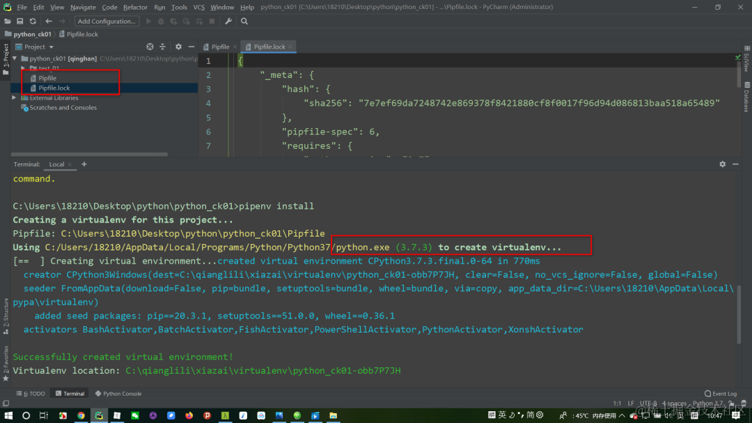 创建好虚拟环境后会生成:一个Pipfile文件和一个Pipfile.lock。