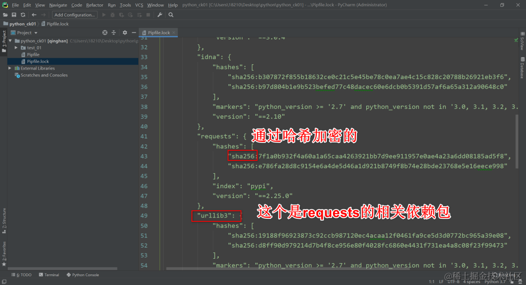 Pipfile.lock文件是通过hash算法将包的名称和版本,及依赖关系生成哈希值,可以保证包的完整性。
