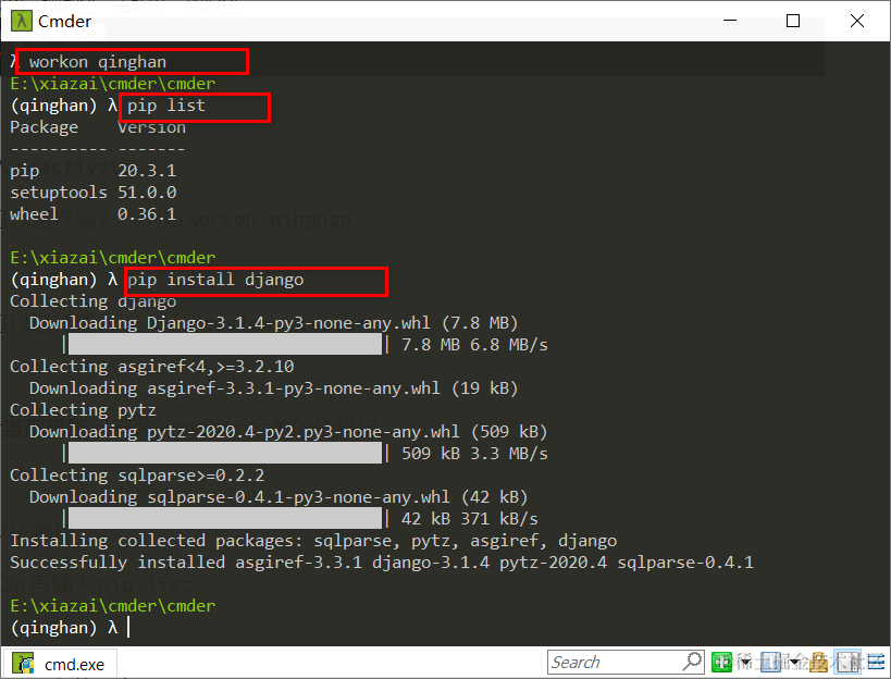 在qinghan这个虚拟环境中安装一个django包: