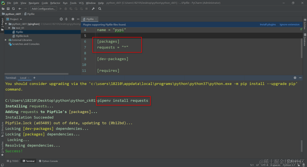 现在安装个包:pipenv install requests