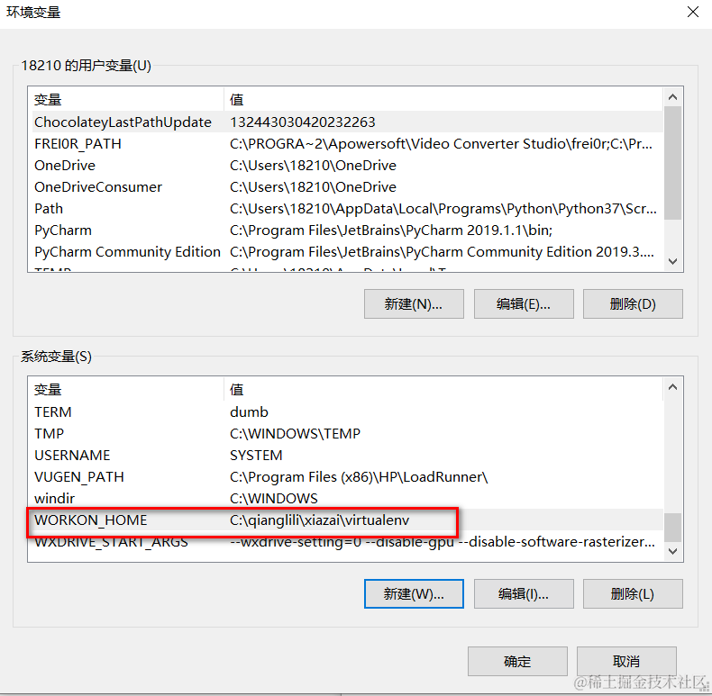 4.配置环境变量(变量名:WORKON_HOME,值:上面创建的目录路径)