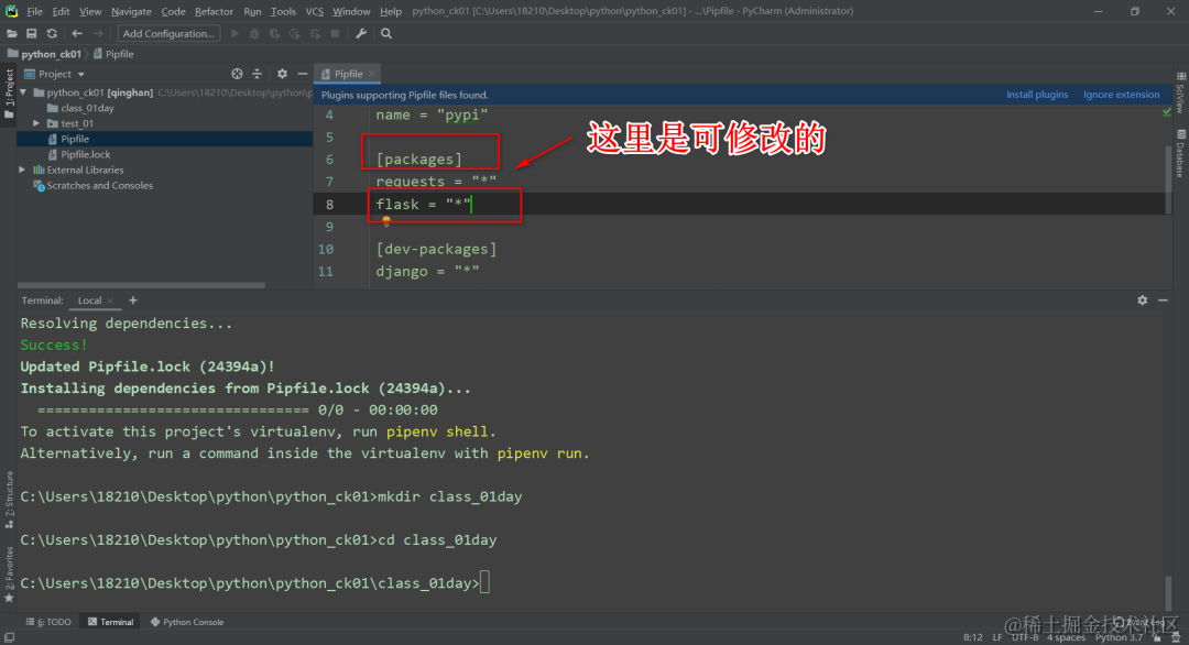 之前在test_01文件夹下的Pipfile文件里手动添加的flask = "*"。