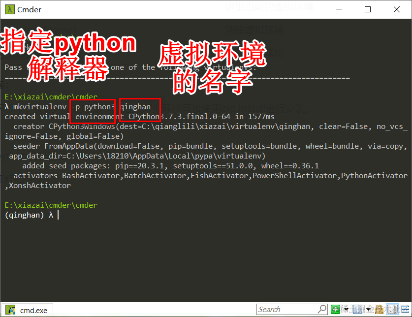如果电脑里只安装了python3,那么直接输入mkvirtualenv qinghan