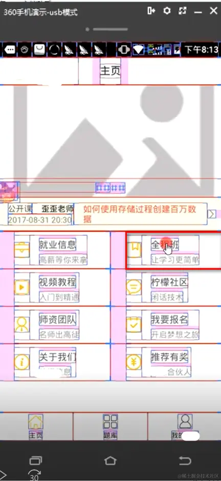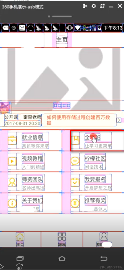 开启显示布局边界,你看到的每一个元素,它都把它框起来了。一个框代表一个原生控件中的一个元素(原生控件中的一个控件或者一个布局)。