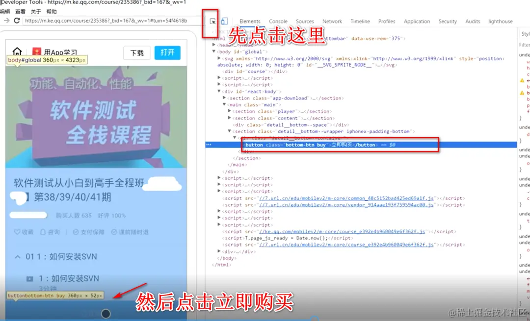 得像 Web 自动化一样,先在这个界面找到立即购买的链接(也就是整个 Html 页面)找到了之后才能去点击。