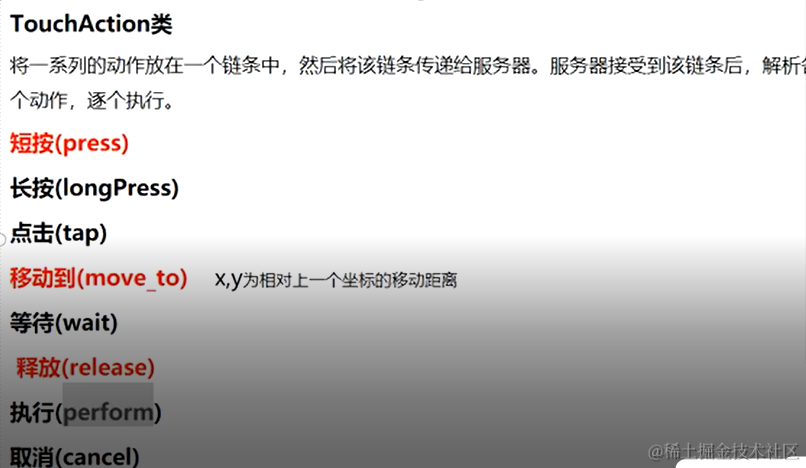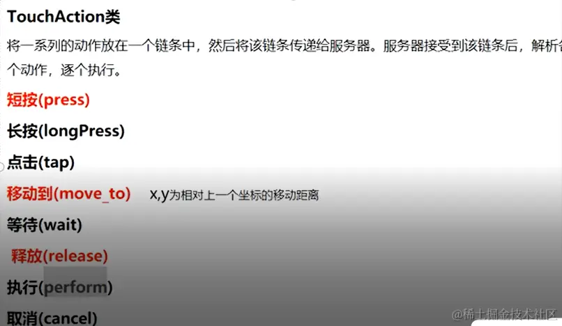 滑屏也是触屏实现的。手指在屏幕上点点点,在 Appium 中提供了专门的TouchAction类来做这件事。