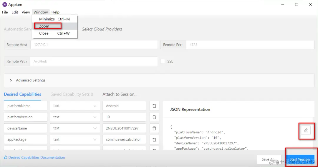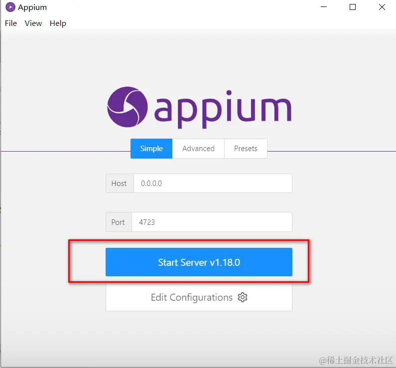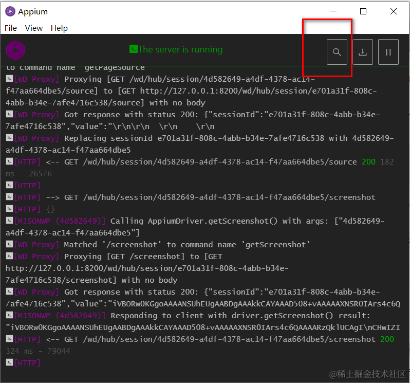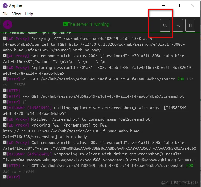 点击下 Start Server 这个按钮,提示你已经启动了。ip 是本机的 ip,端口号默认是 4723 可以修改。需要自己手动启动让这个中间程序在线,你才可以用 Python 代码实时向它发送命令,只有它启动了才能接收到你的请求。