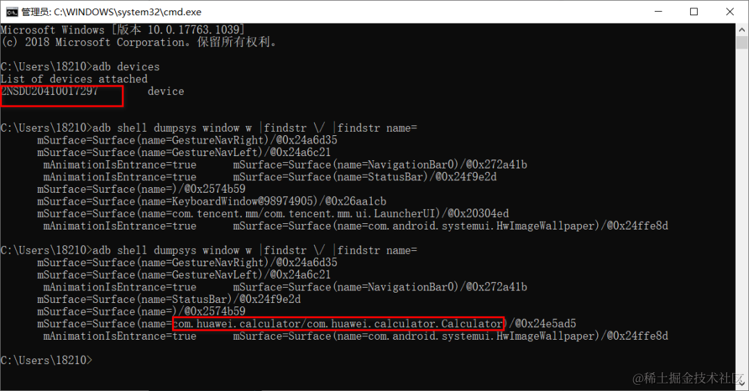 adb shell dumpsys window w |findstr \/ |findstr name=