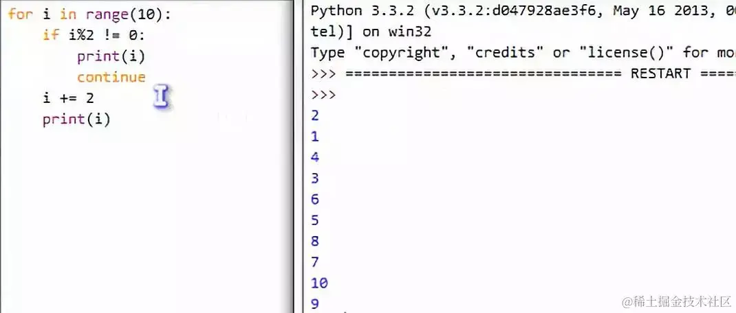 continue语句的作用是终止本轮循环并开始下一轮循环(在开始下一轮循环的时候,会先测试循环条件,只有循环条件为True才会开始下一轮循环,如果不符合条件,就会退出循环)。