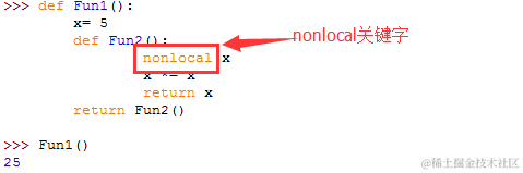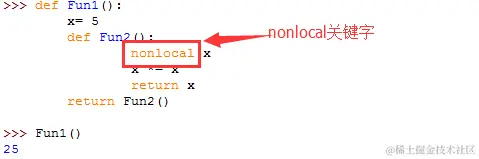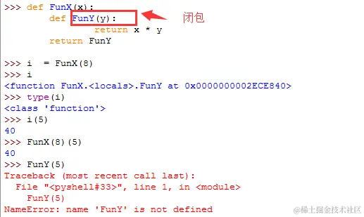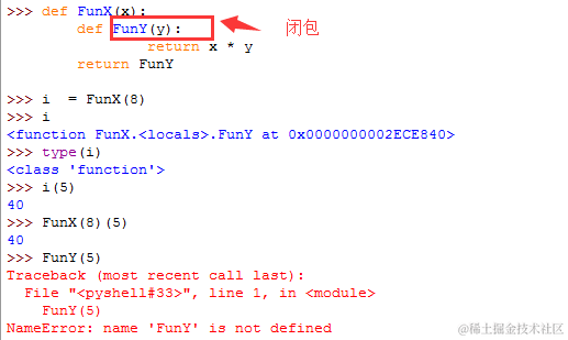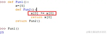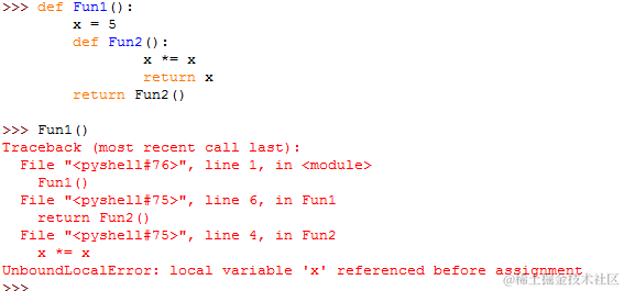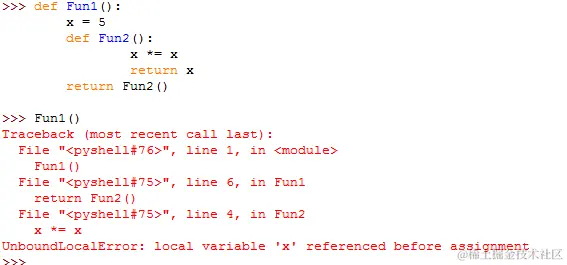 在执行return Fun2()的时候,跑到Fun2()的里面去执行,而Fun2()的整个外部空间,是Fun1()的外部空间。x =5 相当于非全局变量的外部变量,在Fun2()的外部作用域里面。试图修改的时候,外部函数的x就会被屏蔽,这跟我们的全部变量和局部变量的道理相同。试图对没有定义过的数据进行平方操作,那么肯定会被报错。