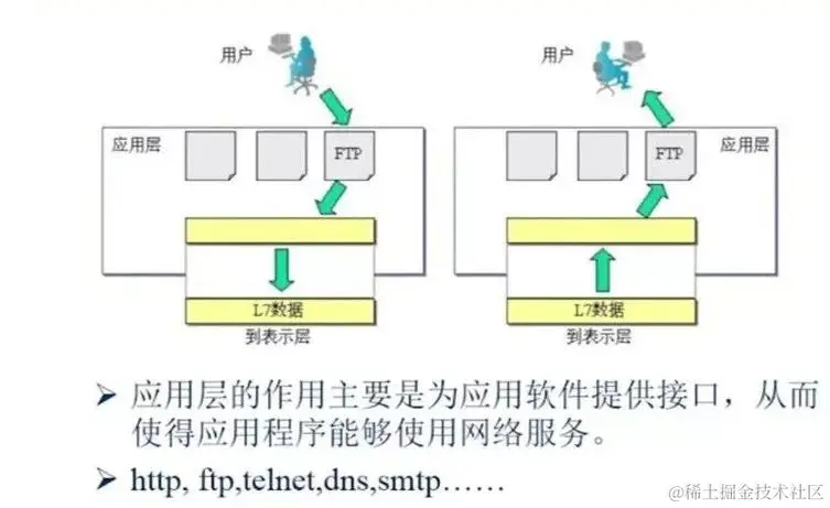之所以称为应用层,因为最终把网络部署完毕后我们要使用它。每一个应用层的内容就是相应的一个应用程序,应用层向外传输数据才启用传输层。