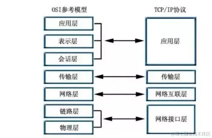 OSI和TCP,物理层和链路层,TCP把它合二为一了。应用层、表示层和会话层,TCP把它合二为一,因为会话层本身也属于应用程序这一端。我们常用的是TCP端。