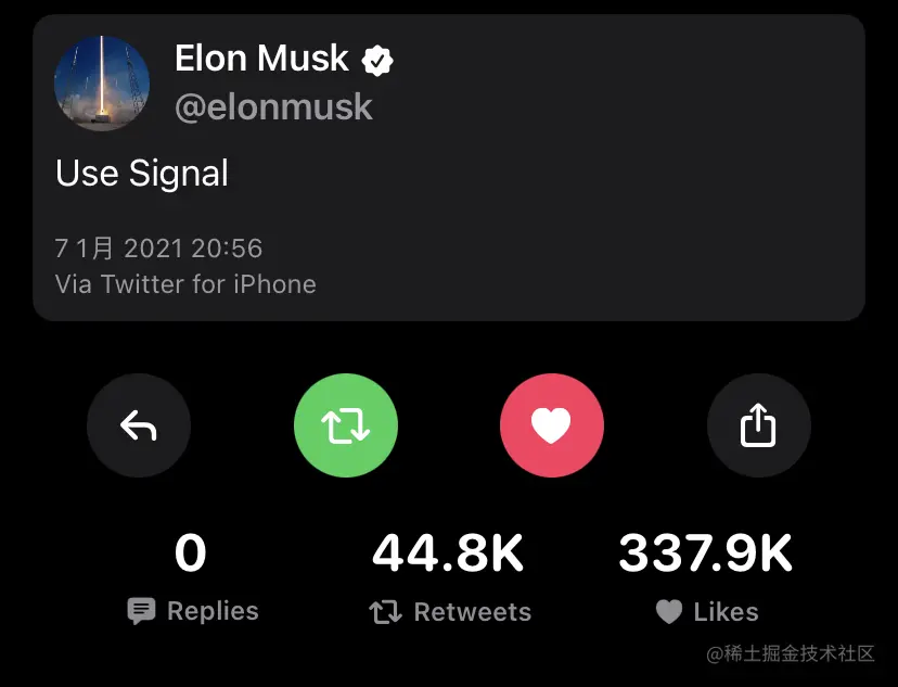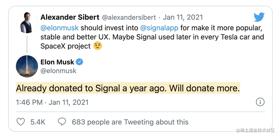 刚成为世界首富的男人 Elon Musk,在上周发了一条 Tweet:Use Signal.