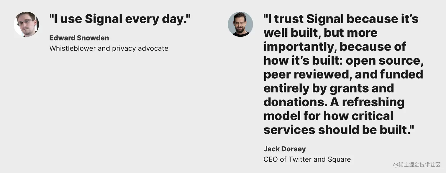 在 Signal 的官网,也可以看到很多大佬的推荐,其中包括斯诺登和 Twitter 的 CEO。