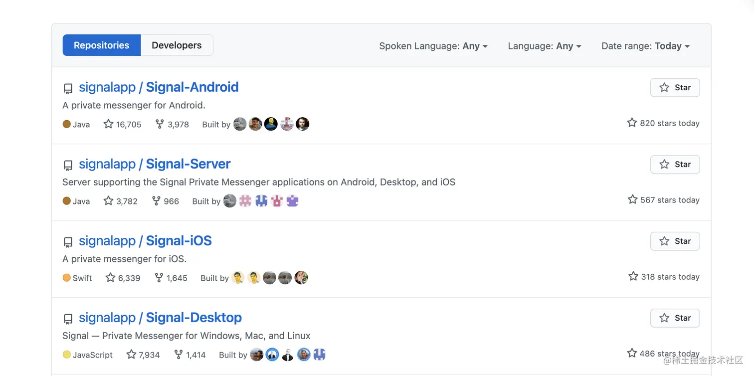 近期的 GitHub Treding 也被 Signal 霸榜了。