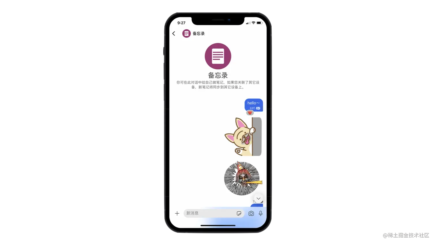因为暂时没有好友注册,因此这里选择和自己对话,系统默认识别为备忘录。