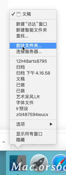 1.鼠标右键点击「访达」图标,选择「前往文件夹」:
