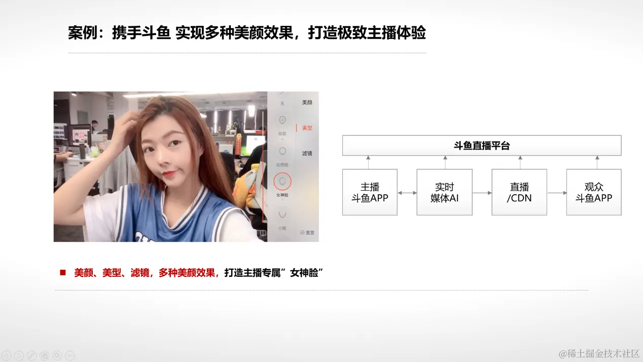 目前我们正在跟斗鱼一起做美颜、美型、滤镜、贴纸等实时云端特效,这些特效会集成在斗鱼的直播平台里面,后续虚拟形象、背景替换等特效也会陆续上线。