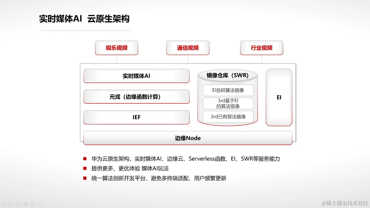从下往上看,首先它是基于华为云的边缘节点,用华为云IEF边缘管理服务对整个的节点软硬件资源做一个纳管,进行调度。其次,框架基于华为云EI平台,提供ModelArts训练等多种能力,支持Tensorflow、PyTorch等主流深度学习框架。框架里还包含一个SWR(镜像仓库)的服务,这个服务既可以集成发布华为EI自研算法镜像,也可以集成第三方基于EI的算法镜像。还有一个关键点要介绍,我们提供一个高性能边缘函数计算能力,这个能力实际上是面向实时媒体AI业务做的一个函数级处理框架结构,它可以非常高性能地将所有的AI算法实时调度到边缘节点上,并对边缘函数进行编排。实时媒体AI平台,用于卸载终端上的媒体处理能力,减少媒体处理适配不同终端平台的开发量,并保证不同终端平台体验效果一致,面向不同解决方案提供归一化的媒体处理能力。