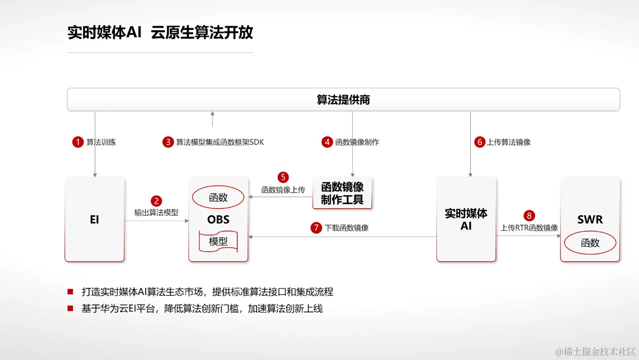 基于这个想法,华为云构建了一个算法开放的流程,包括所有实时媒体AI算法的标准算法接口和集成流程,也包括算法生态市场的构建,我们都会陆续的推出。这样的话,不管是基于华为EI平台去构建的AI算法,还是考虑到数据的隐私性,基于自己的平台去构建的AI算法,都可以通过这个流程集成到我们实时媒体AI里面。