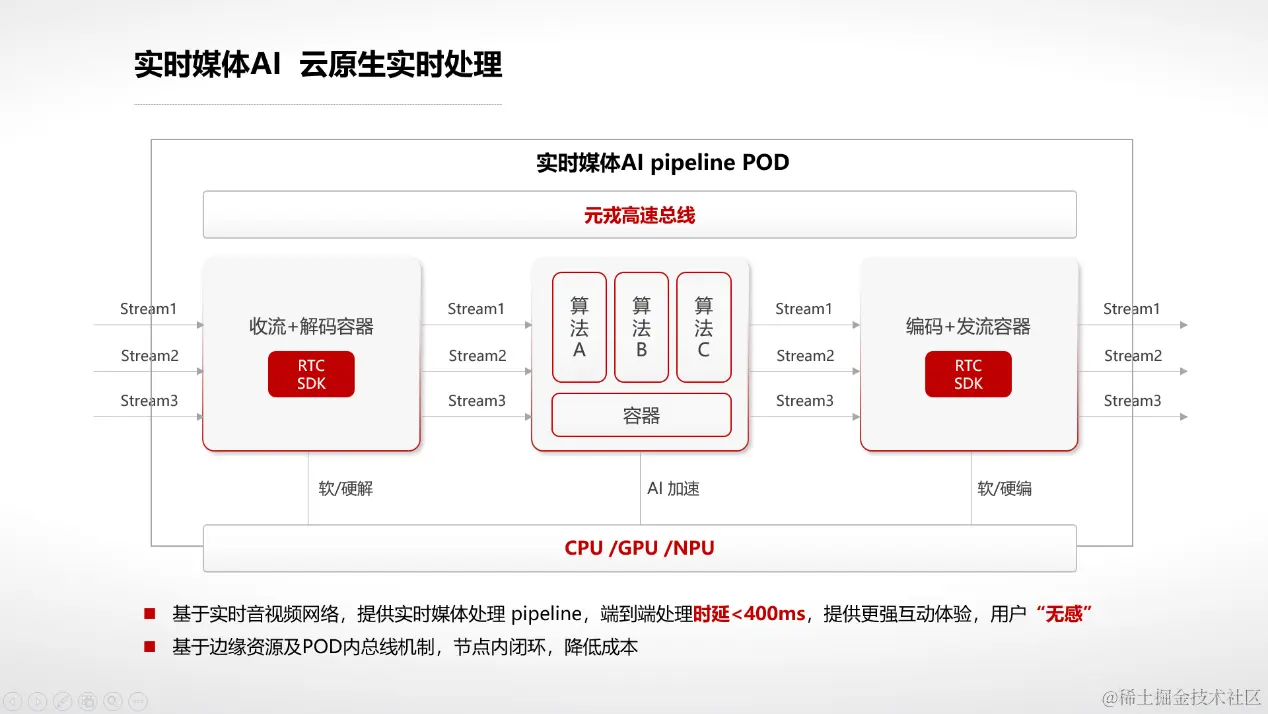如前面所述,实时媒体AI的核心是实时,如何最大程度的降低端到端处理时延,让用户对延迟“无感”。