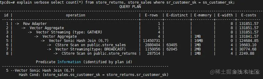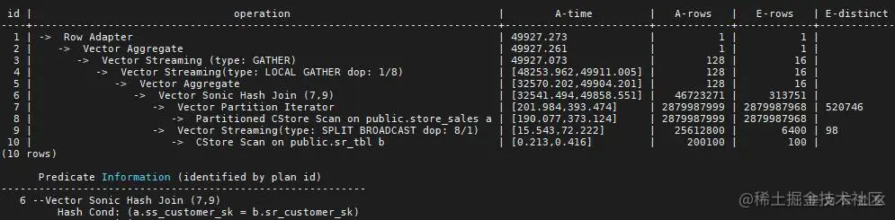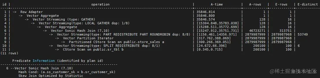 我们考虑两个表的简单关联,store_sales和sr_tbl,它们的分布键分别是ss_item_sk 和sr_returned_date_sk,Join 条件是store_sales.ss_customer_sk =sr_tbl. sr_customer_sk,执行结果如下: