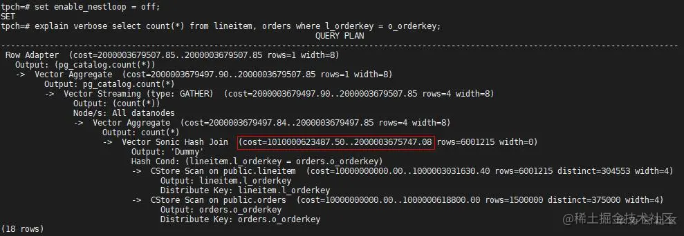 扫描路径都变为了Seq Scan,而且Seq Scan的代价都很大。此时既然都走了Seq Scan,为什么不选Hash Join呢,把Nest Loop关掉,看看Hash Join计划的代价: